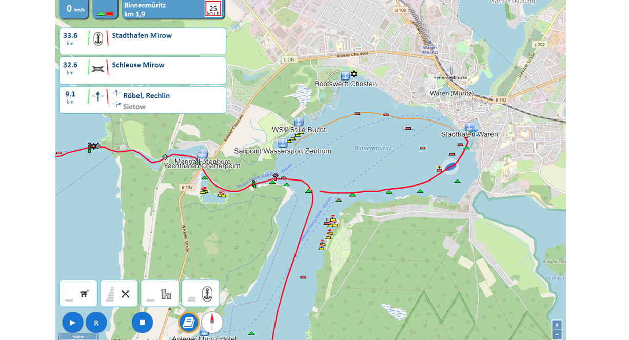 Das Navi-Display auf der Yacht zeigt das meiste automatisch an: Position, Tonnen, Wegweisung, nächste Schleusen und Ziele. Eingaben sind kaum nötig. Beim Landgang hilft die Fußwegführung zum Museum, Kirche, Geschäft und Restaurant.